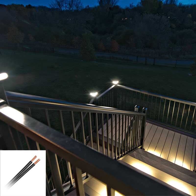 Most modern deck lighting uses LEDs and a 12 volt transformer plugged into a wall outlet. This makes lighting relatively easy and low-risk to install.