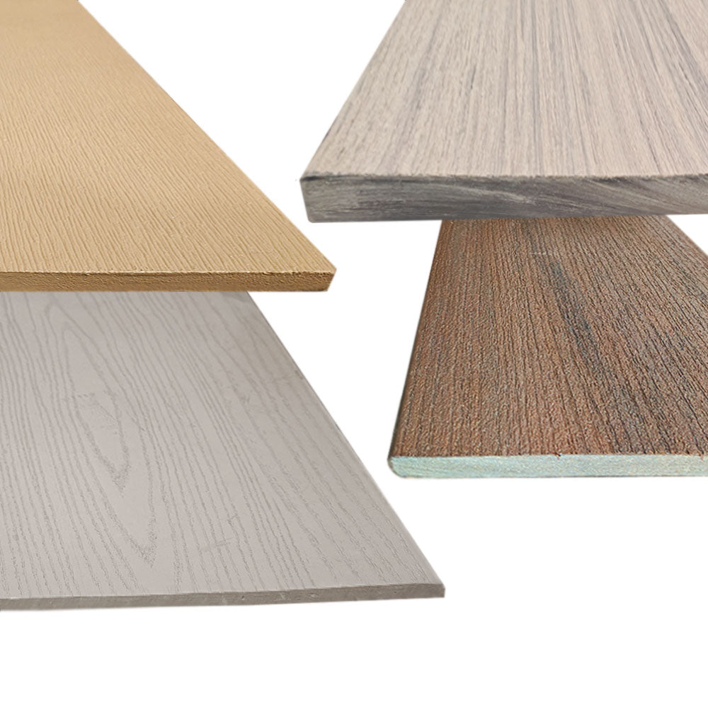 Composite fascia is available for every family of composite decking we sell, and usually measures 11-3/4" wide, and between 5/8" and 7/8" thick. Riser boards are available for most composite board collections, which usually measure about 7-1/2" wide. The extra thickness makes the board more stable, and allows for screws with plugs to be used in place of visible color-matched screws.