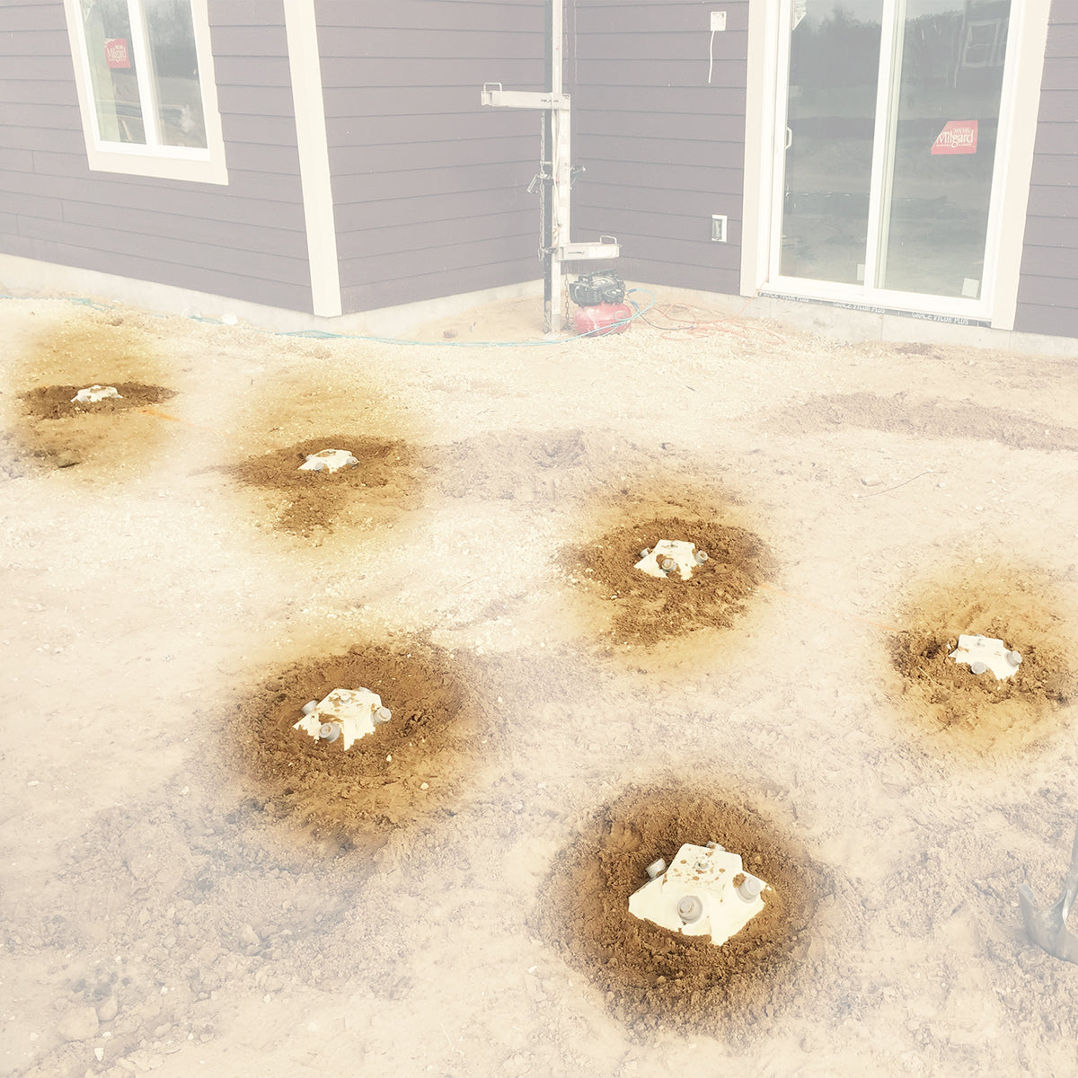 Every deck support post should rest on some sort of footing, whether that be a Diamond Pier (shown), a helical screw pile, or concrete cylinder.