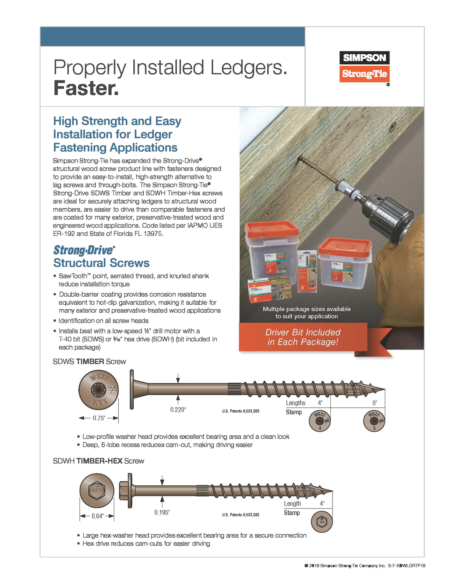 Ledgers should be secured to the house with 5" lag screws (or longer) through the house wall, and into the house framing. Simpson SDWS screws or LedgerLok screws are two common options for securing the ledger.