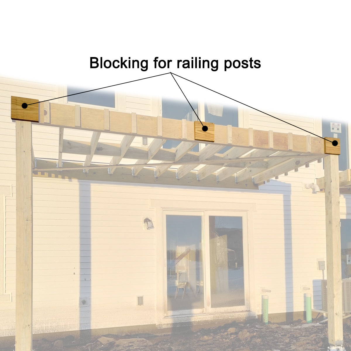 Most modern railing systems use posts that have a surface-mount base, meaning that they will mount to the framing beneath the posts. A post base usually measures about 5"x5", and will need a solid blocking area of that size beneath it for the lag screws to screw into.