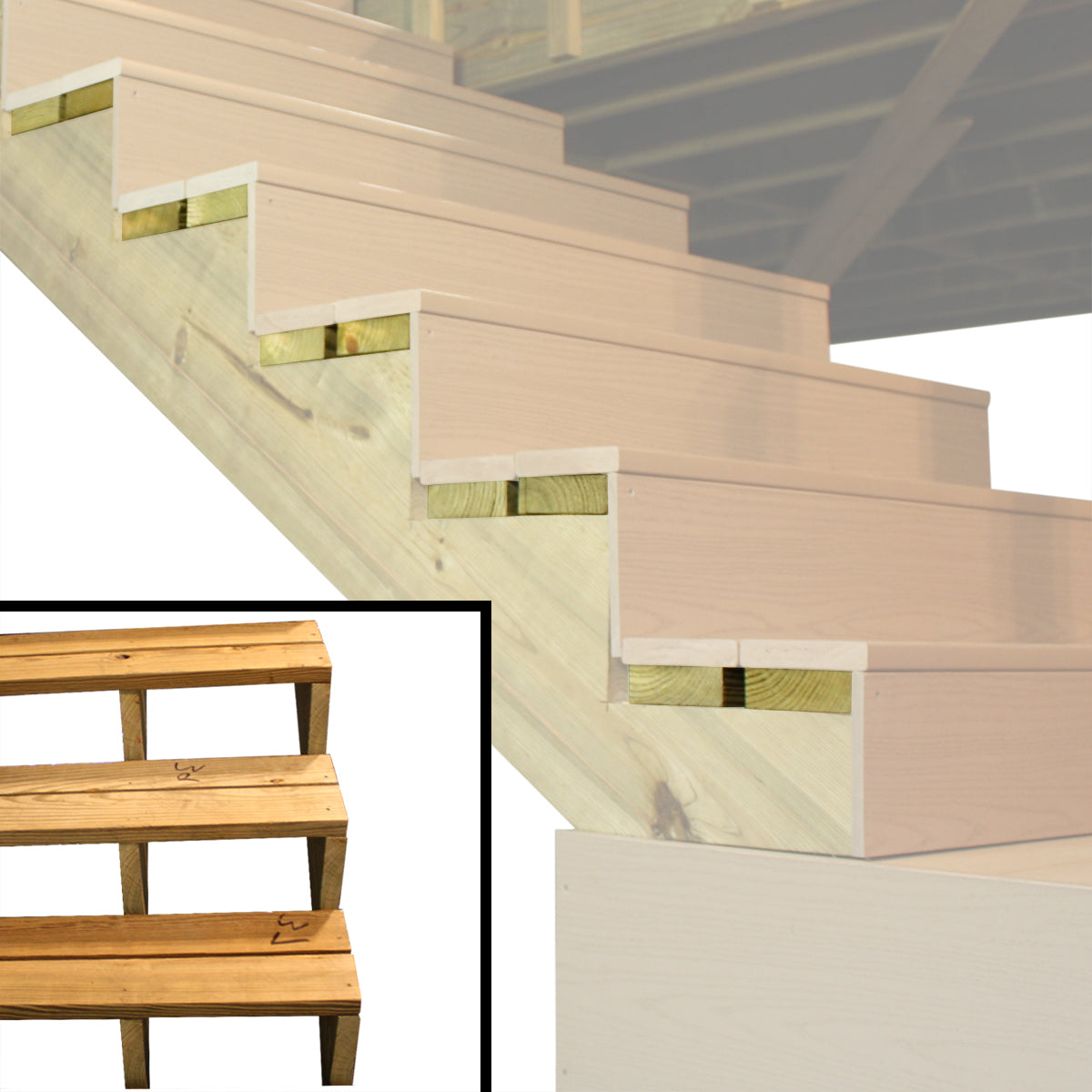 When using subtreads, a piece of treated 2x material is installed beneath each deck tread, which is most easily made by cutting a 2x10 in half.