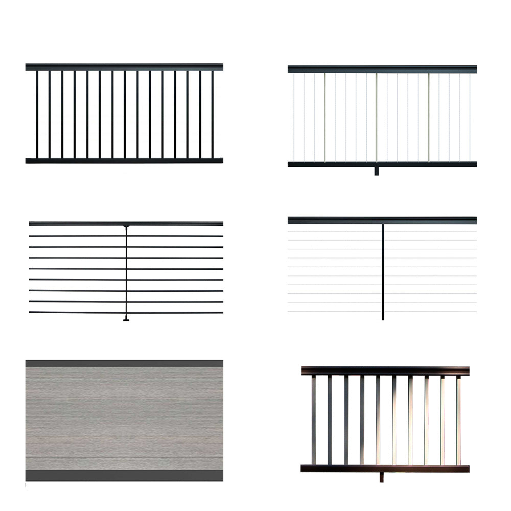 Other infill styles include aluminum balusters, vertical cables, horizontal rods, horizontal cables, privacy panels, and composite panels.