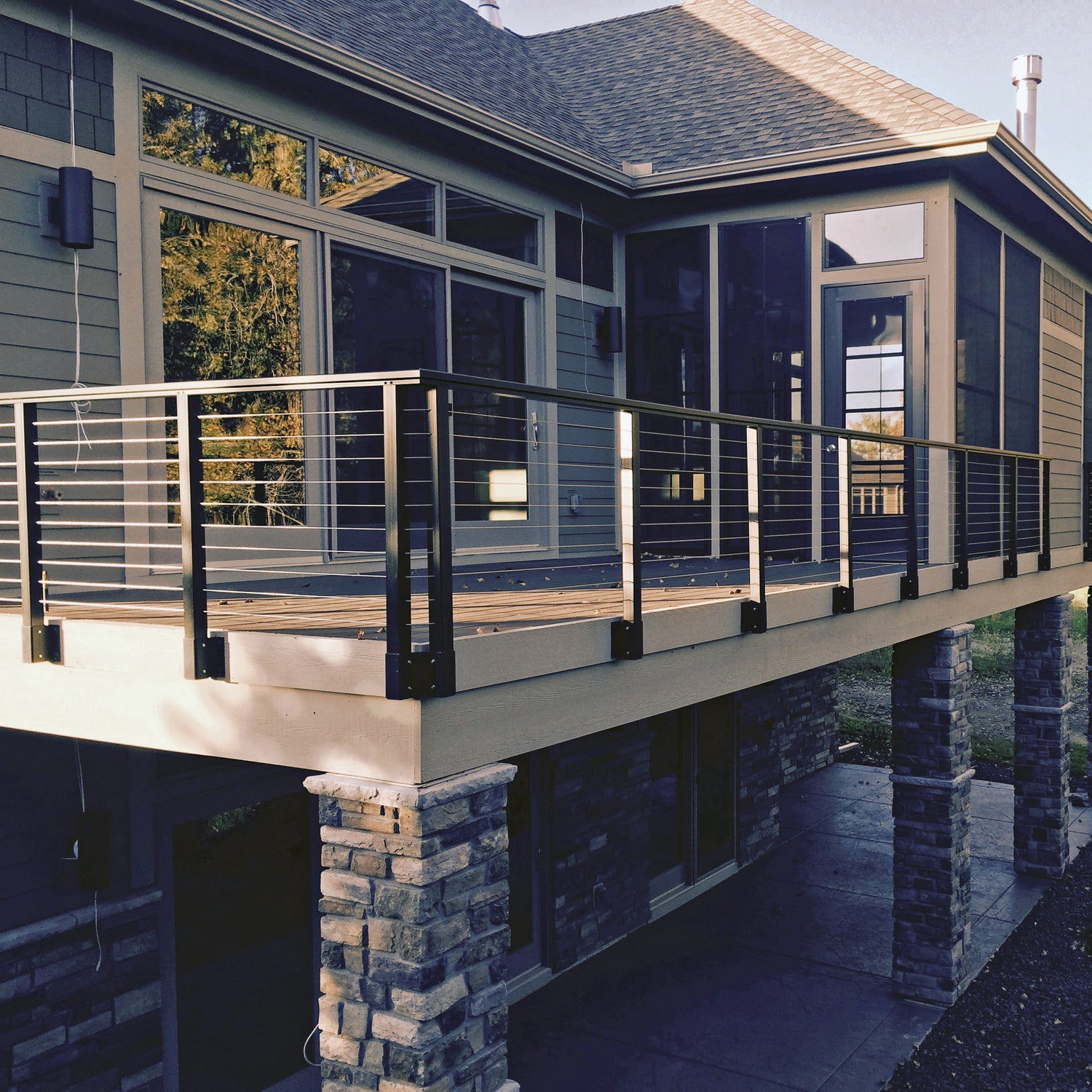 A sort of crossover between baluster railing and horizontal cable railing, vertical cable railing is similar in price to horizontal cable, but has the advantage of being installed more like an aluminum panel. Due to the cables being vertical, climbing up the cables is less of a concern than if they were horizontal. Most vertical cable systems will also have intermittent vertical balusters to keep the tensioned cables from bending the top and bottom rails.