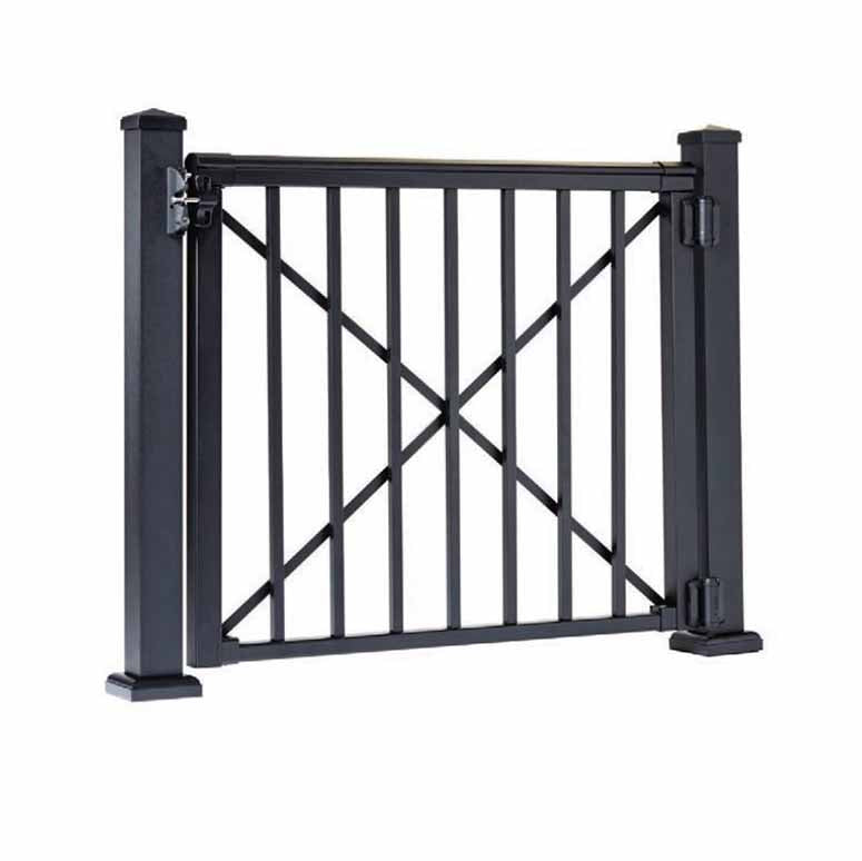 Gate with aluminum balusters and cross bracing.