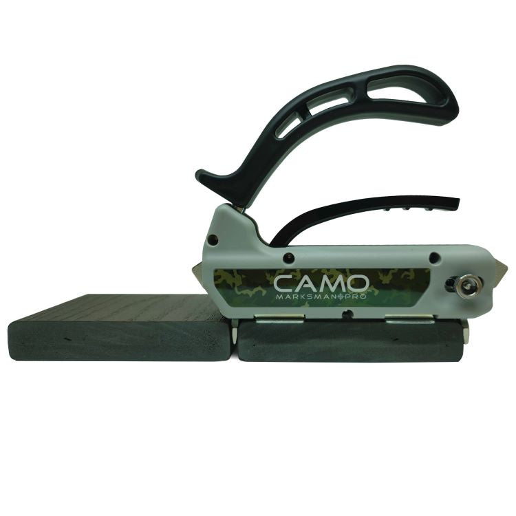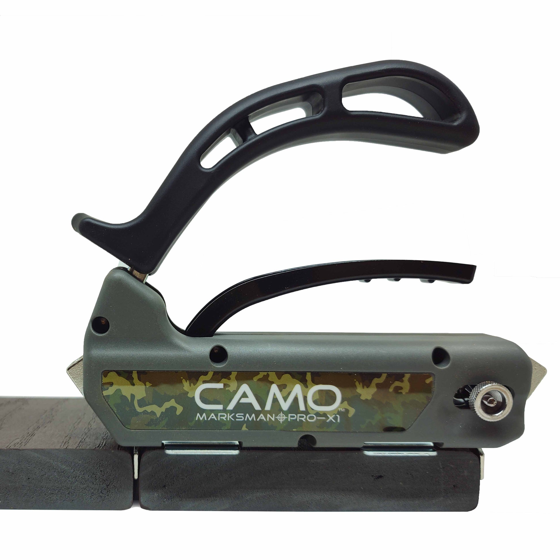 Camo Marksman tools clamp onto the deck board being fastened, and guide an edge screw through the board, as well as helping space the boards from each other.