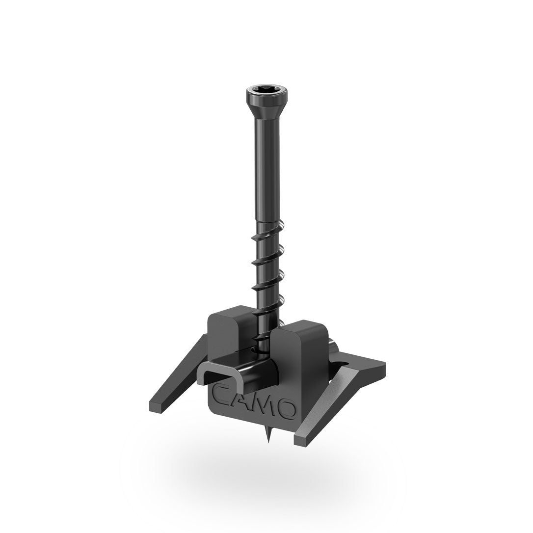 Camo clips are designed to stay in place joist while the boards are compressed together with a Camo lever, so the decking can be quickly installed with a Camo Drive shaft, while maintaining a consistent gap size.