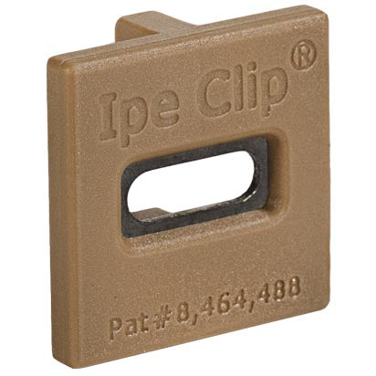 Hidden fastener clip for installing grooved Ipe and hardwood decking, by Deckwise. Compatible with most standard Ipe decking grooves, but may not be compatible with every version of hardwood decking. 100 sq. ft. boxes, brown color