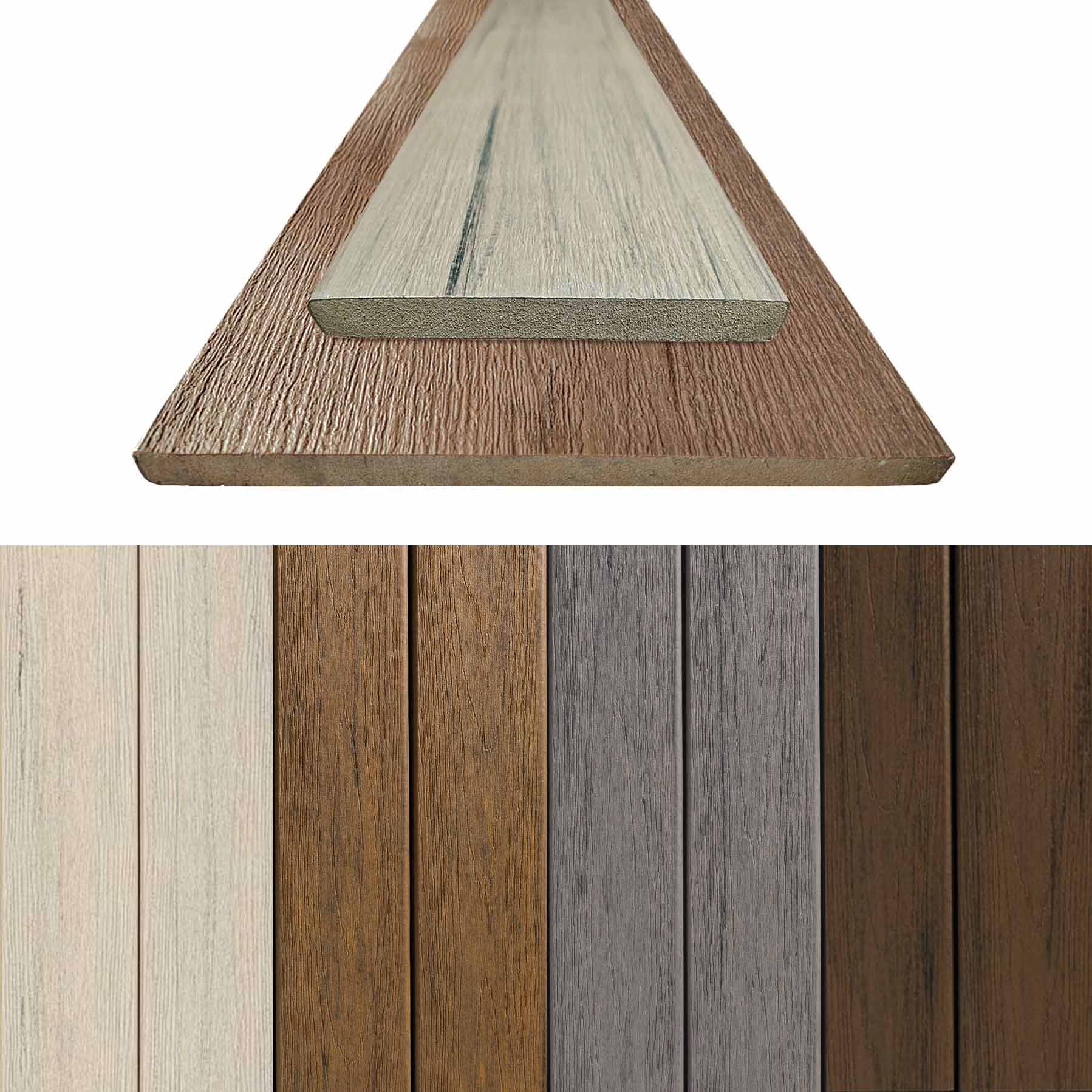 Wide, non-structural (5/8" thick) fascia boards with an identical color patterning and similar texture to Timbertech Reserve decking.