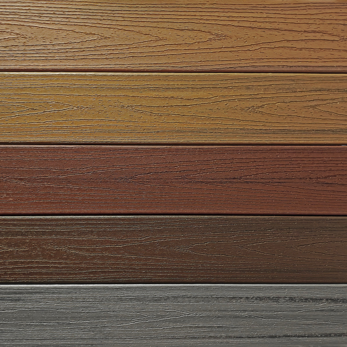 Premium-level variegated composite decking, available in both grooved and square edge (non-grooved) profiles.